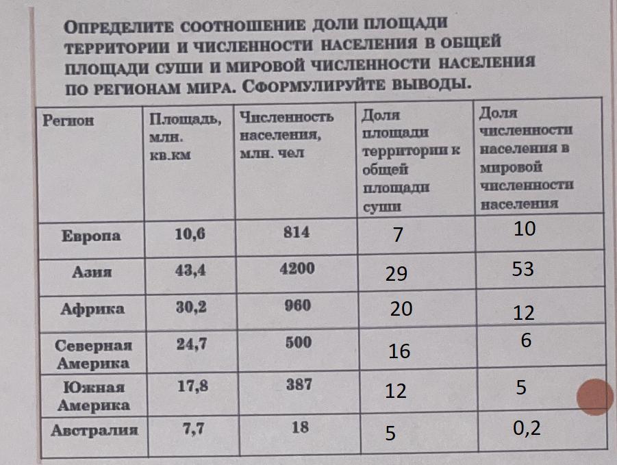 ОПРЕДЕЛИТЕ СООТНОШЕНИЕ ДОЛИ ПЛОЩАДИ ТЕРРИТОРИИ И ЧИСЛЕННОСТИ НАСЕЛЕНИЯ В ОБЩЕЙ ПЛОЩАДИ СУШИ И МИРОВОЙ ЧИСЛЕННОСТИ НАСЕЛЕНИЯ ПО РЕГИОНАМ МИРА. СФоРмУЛИРУЙТЕ вЫводЫ.