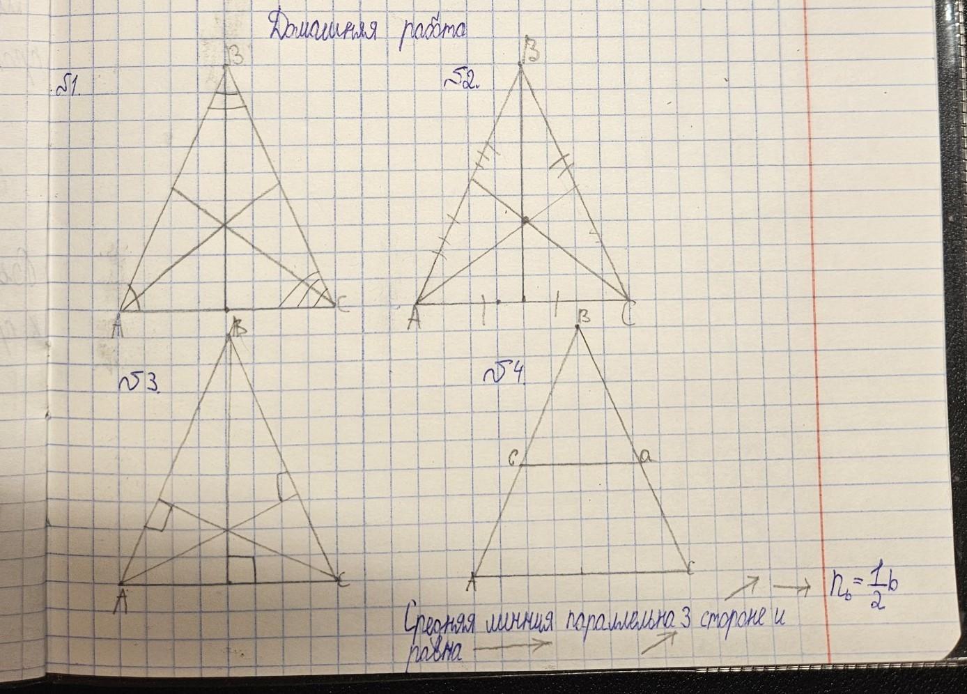 Построить четыре тре- угольника со сторона от 5 см до 10 см, на первом тре- угольнике по- строить три бис- сектрисы, на втором - 3 меди- аны, на третьем З высоты, на 4ом треугольни- ке - три средние линии