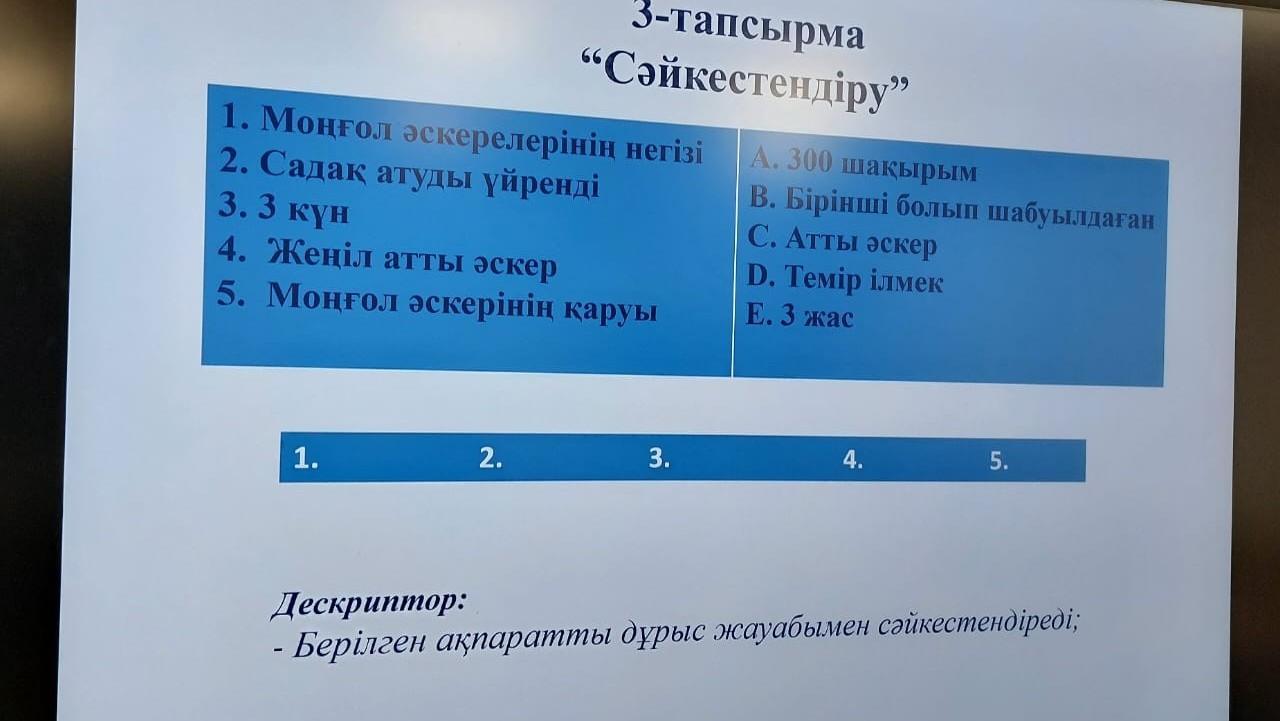 1. Монгол әскерелерiнiн негiзi 2. Садақ атуды үйренді 3. 3 кун 4. Жеңіл атты әскер 5. Моңғол әскерінің қаруы 1. 3-тапсырма “Сәйкестендіру” 2. 3. А. 300 шақырым В. Бiрiншi болып шабуылдаған С. АТТЫ әскер D. Темiр iлмек Е. 3 жас 4. 5. Дескриптор: - Берілген ақпаратты дұрыс жауабымен сәйкестендіреді;