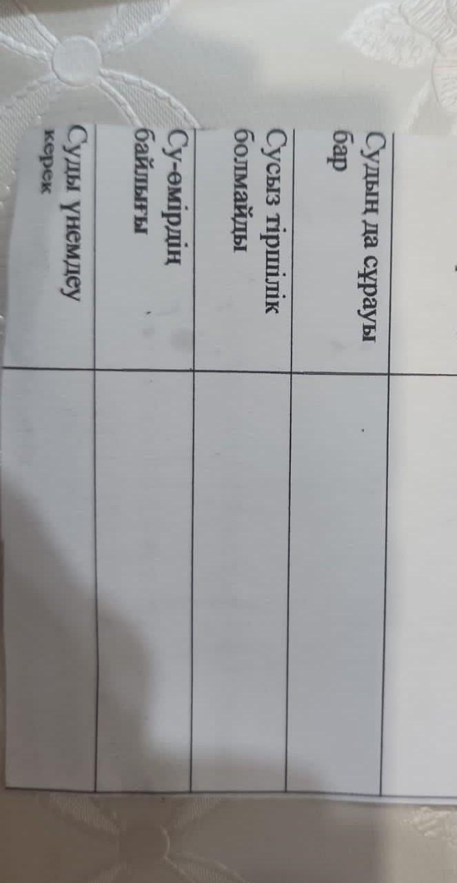 2)Сусыз тіршілік жоқ өйткені су бізге жуыну,ыдыс жуу,кір жуу,үшін керек және біз оны ішеміз.Сусыз тіршілік тығырыққа тіреліп, жойылу қаупі төнеді