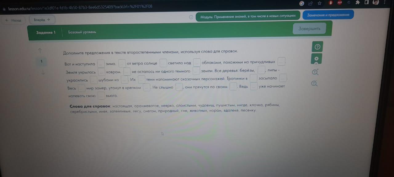 Дополните предложения в тексте второстепенными членами, используя слова для справок.