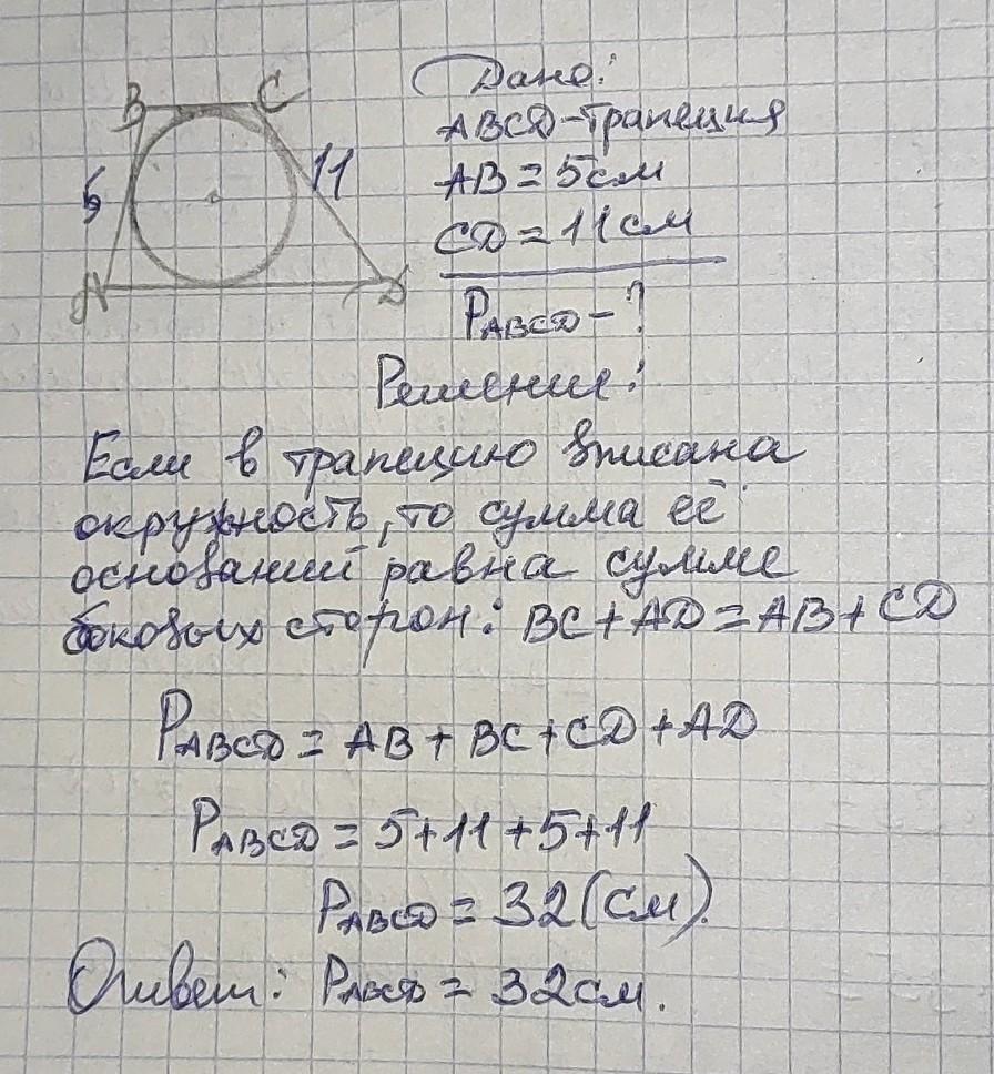 Бічні сторони трапеції, у яку можна вписати коло, дорівнюють 5 см і 11 см. Знайдіть периметр трапеції.
