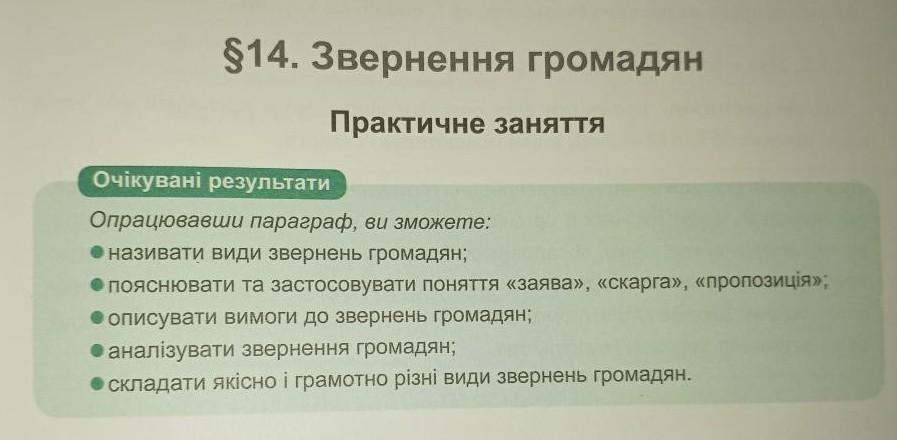 §14. Звернення громадян Практичне заняття Очікувані результати Опрацювавши параграф, ви зможете: називати види звернень громадян; • пояснювати та застосовувати поняття «заява>>,
