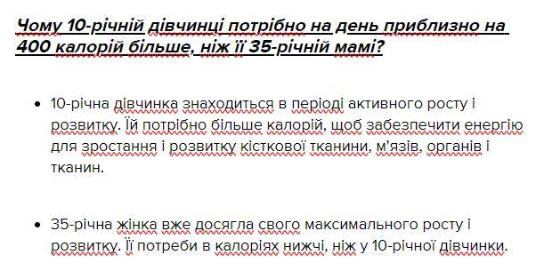2. Поясніть, чому 10-річній дівчинці потрібно на день приблизно на 400 калорій більше, ніж її 35-річній мамі.