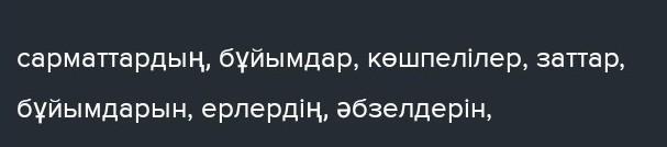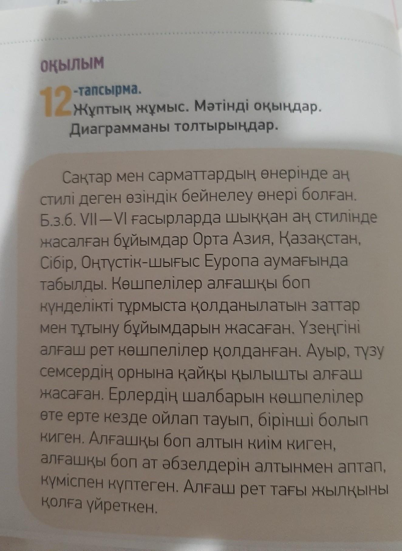 окылым -тапсырма. 12* Жұптық жұмыс. Мәтiндi окындар. Диаграмманы толтырындар. Сақтар мен сарматтардың өнерiнде ан стилі деген өзіндік бейнелеу өнері болған. Б.з.б. VII-VI ғасырларда шыккан аң стилінде жасалған бұйымдар Орта Азия, Қазақстан, Сібір, Оңтүстік-шығыс Еуропа аумағында табылды. Кешпелілер алғашқы боп кунделікті тұрмыста колданылатын заттар мен тұтыну бұйымдарын жасаған. Үзеңгiнi алғаш рет нец елiлер колданған. Ауыр, тузу семсердiң ор 4 кайкы кылышты алғаш жасаған. Ер салбарын көшпелілер өте ерте кез еп тауып, бiрiншi болып и алтын киім киген, киген. Алгашни алғашкы бола абзелдерiн алтынмен аптап, күміспен куптеге Алаш рет тағы жылкыны колга уйреткен.