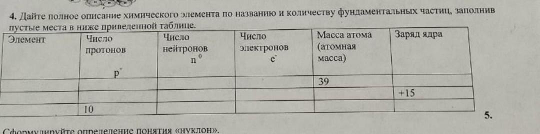 Дайте полное описание химического элемента по названию и количеству фундаментальных частиц, заполнив пустые места в ниже приведенной таблице.