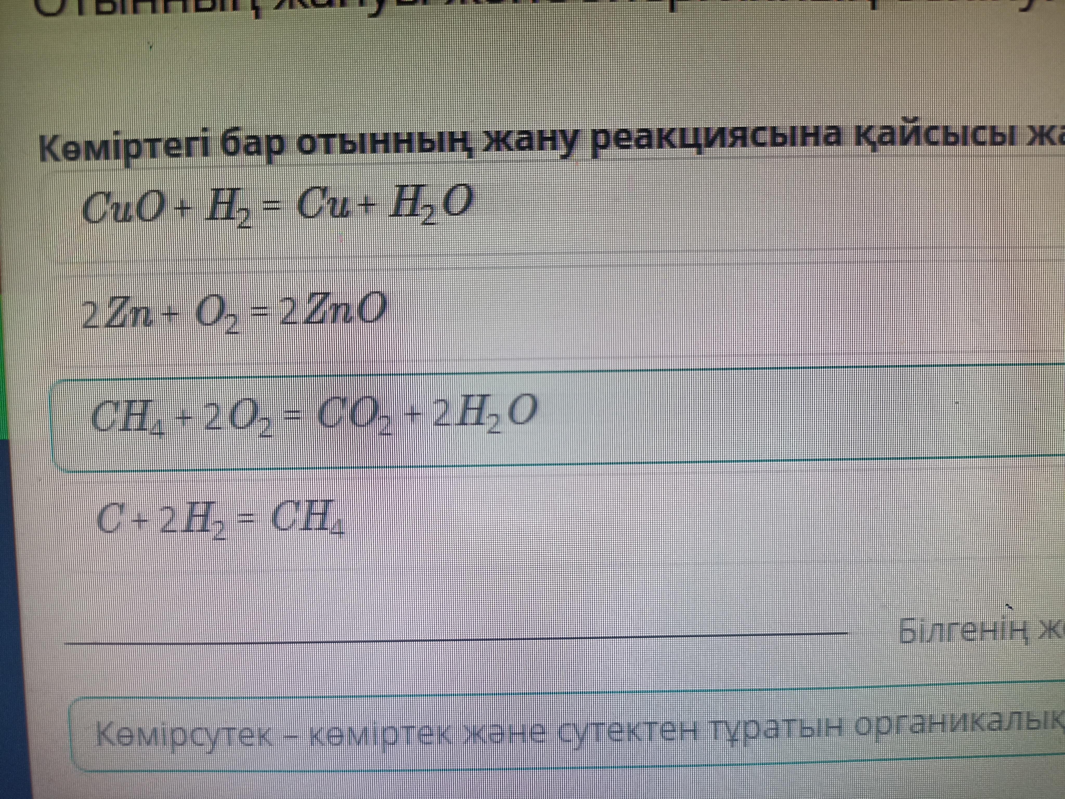 Көміртегі бар отынның жану реакциясына қайсысы жатады? 2Zn + O2 = 2ZnO С+ 2Н2 = СН4 СН4+2O2 = CO2 + 2H2O CuO + H2 = Cu + H2O