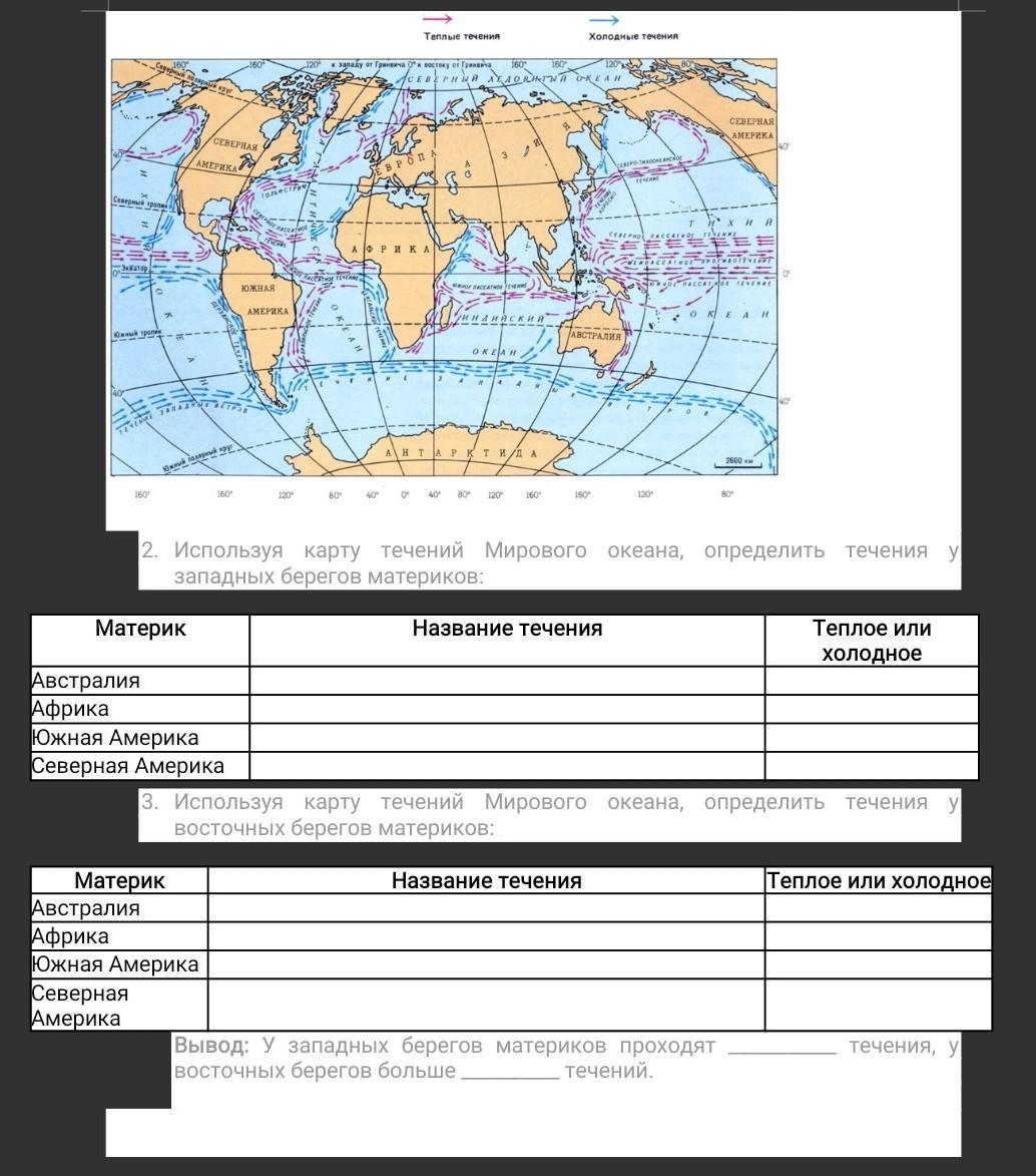 Вывод: У западных берегов материков проходят холодные течения, у восточных берегов больше тёплые течения.