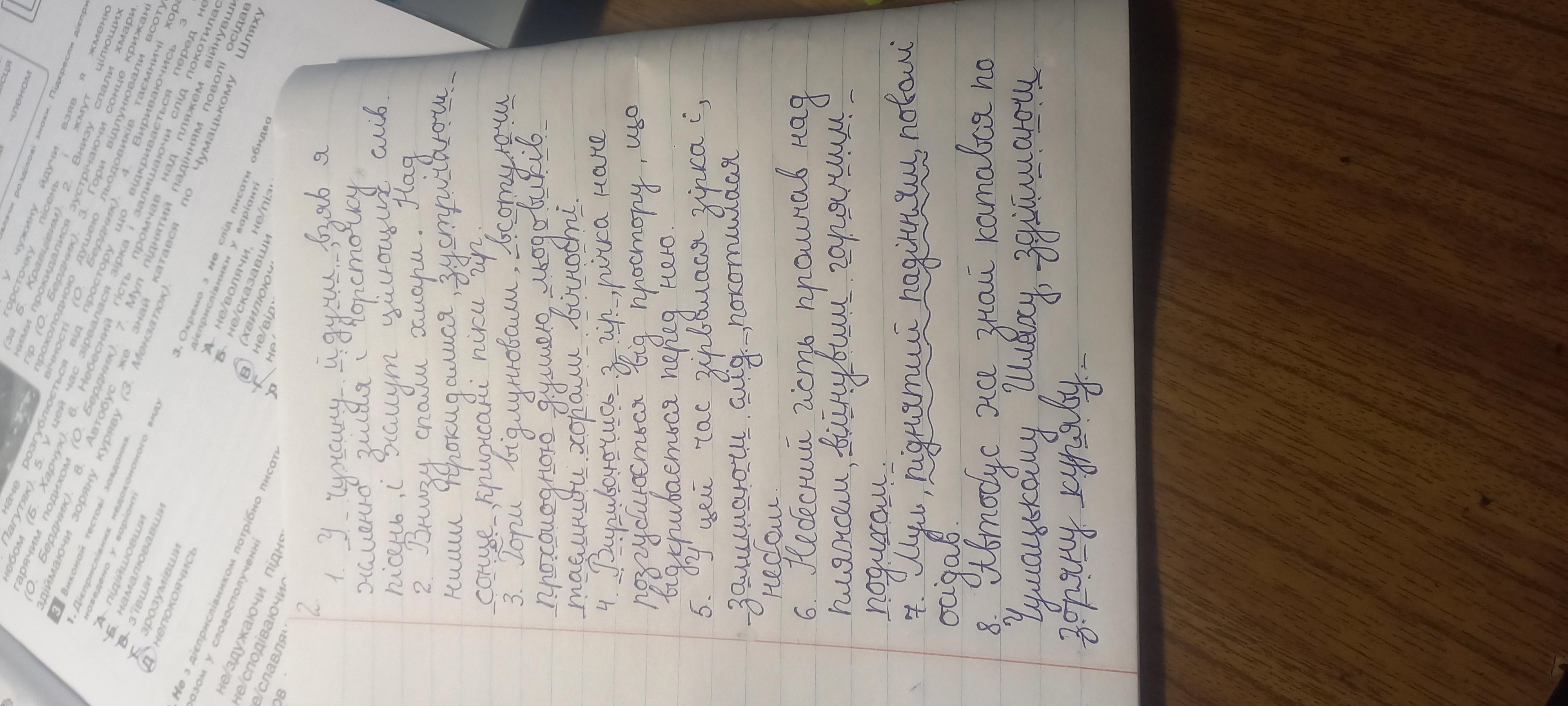 2 Перепиши речення в робочий зошит, ставлячи розділові знаки. Підкресли дієприслівникові звороти як члени речення. i 1. У чужину йдучи ВЗЯВ я жменю зiлля горсточку пісень i жмут цілющих слiв (за Б. Кравцівим). 2. Внизу спали хмари. Над ними прокидалися зустрічаючи сонце крижані піки гір (О. Бердник). 3. Гори відлунювали всотуючи прохолодною душею льодовиків таємничі хорали вічності (О. Бердник). 4. Вириваючись 3 з гір річка наче розгублюється від простору що відкривається перед нею (Г. Пагутяк). 5. У цей час зірвалася зірка і залишаючи слід покотилася небом (Б. Харчук). 6. Небесний гість промчав над пляжем війнувши гарячим подихом (О. Бердник). 7. Мул піднятий падінням поволі осідан (О. Бердник). 8. Автобус же знай катався по Чумацькому шляху здіймаючи зоряну куряву (3. Мензатюк).15 балов