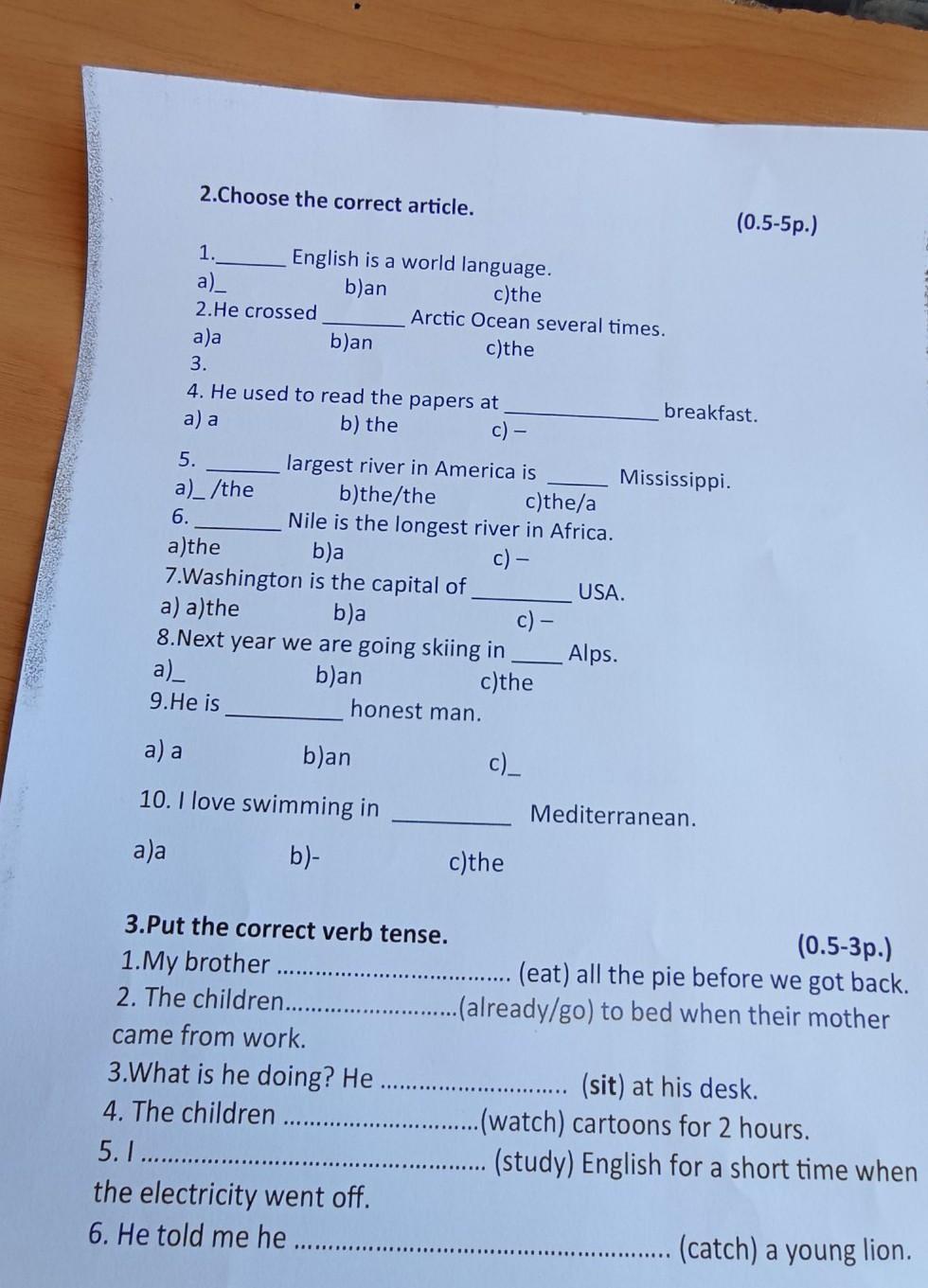 2.Choose the correct article. 1. a)__ 2.He crossed English is a world language. b)an c)the Arctic Ocean several times. a)a b)an c)the 3. 4. He used to read the papers at a) a b) the c) - 5. a)_/the 6. a)the largest river in America is b)the/the c)the/a Nile is the longest river in Africa. c) - b)a 7.Washington is the capital of b)a a) a)the a)__ 9.He is 8.Next year we are going skiing in b)an c)the honest man. a) a b)an 10. I love swimming in a)a b)- 3.Put the correct verb tense. 1.My brother 2. The children...... came from work. 3.What is he doing? He 4. The children 5.1 the electricity went off. 6. He told me he.... c) - c)_ c)the USA. Alps. Mississippi. breakfast. (0.5-5p.) Mediterranean. (0.5-3p.) (eat) all the pie before we got back. ..(already/go) to bed when their mother (sit) at his desk. ..(watch) cartoons for 2 hours. (study) English for a short time when (catch) a young lion.