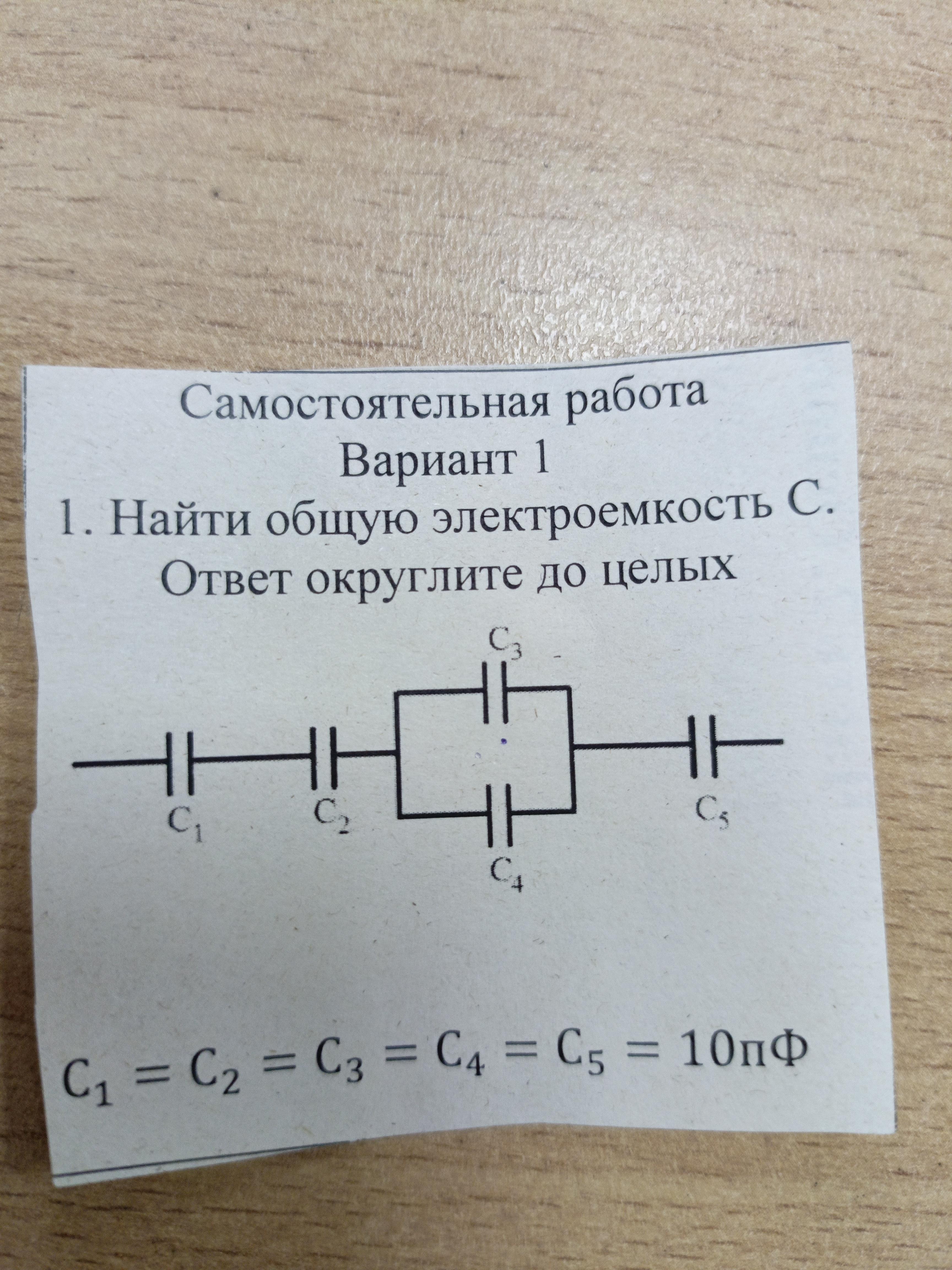 C=1/(1/C1+1/C2+1/(C3+C4)+1/C5)=1/(1/10+1/10+1/(10+10)+1/10)=20/7=