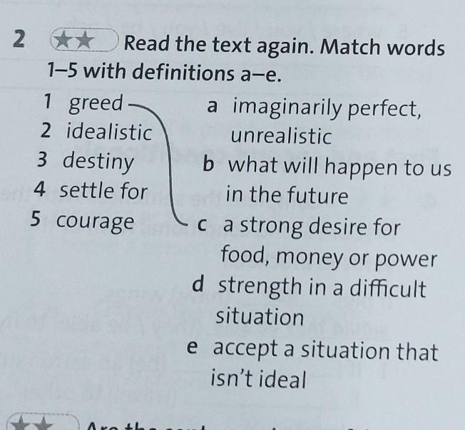 2 Read the text again. Match words 1-5 with definitions a-e. 1 greed 2 idealistic 3 destiny 4 5 settle for courage a imaginarily perfect, unrealistic b what will happen to us in the future c a strong desire for food, money or power d strength in a difficult situation e accept a situation that isn't ideal