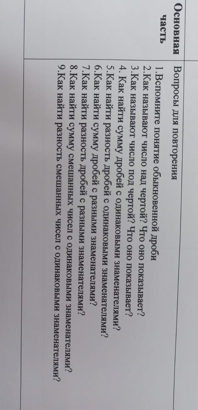 ая вопросы для повторения 1.Вспомните понятие обыкновенной дроби 2.Как называют число над чертой? Что оно показывает? 3.Как называют число под чертой? Что оно показывает? 4. Как найти сумму дробей с одинаковыми знаменателями? 5.Как найти разность дробей с одинаковыми знаменателями? 6.Как найти сумму дробей с разными знаменателями? 7.Как найти разность дробей с разными знаменателями? 8.Как найти сумму смешанных чисел с одинаковыми знаменателями? 9.Как найти разность смешанных чисел с одинаковыми знаменателями? дам не обман дам 20 н