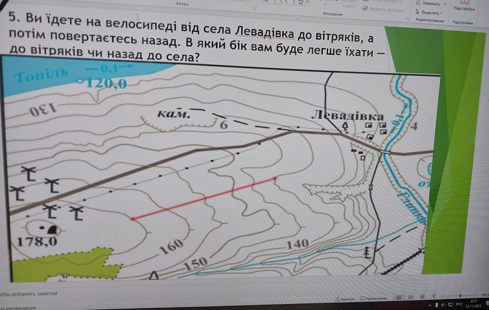 До вітряків. Висота рельєфу від села до вітряків збільшується, тобто їхатиме на верх до вершини пагорба, а від вітряків до села їхатиме зверху в них з пагорба.