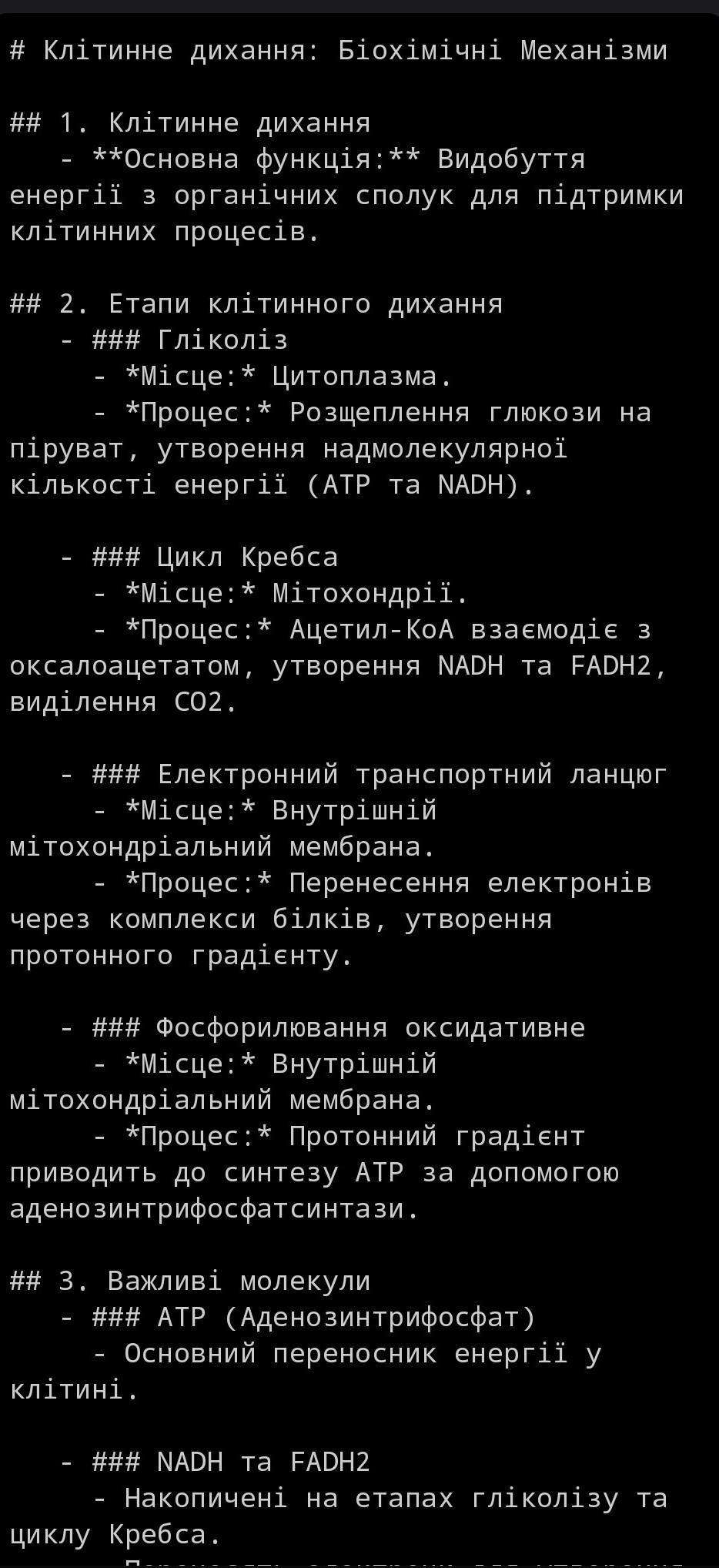 Ця інтелект-карта надає структурований огляд біохімічних механізмів клітинного дихання та ключових понять, пов'язаних із цією темою.
