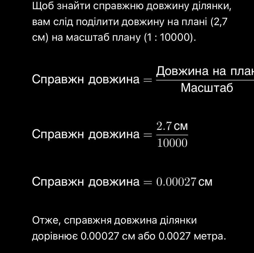 Довжина ділянки на плані 2,7 см .Яка справжня довжина цієї ділянки ,якщо план складено в масштабі 1 : 10000