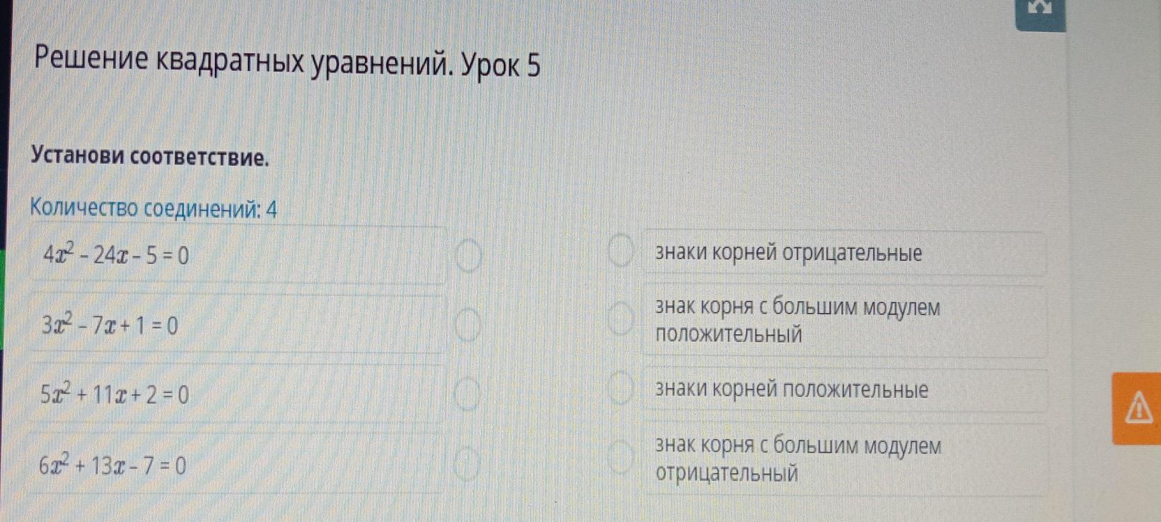 Решение квадратных уравнений. Урок 5 Установи соответствие. Количество соединений: 4 42 - 242-5 - 0 3x² - 7x+1=0 52²2² +11+2=0 6x² +132-7=0 знаки корней отрицательные знак корня с большим модулем положительный знаки корней положительные знак корня с большим модулем отрицательный