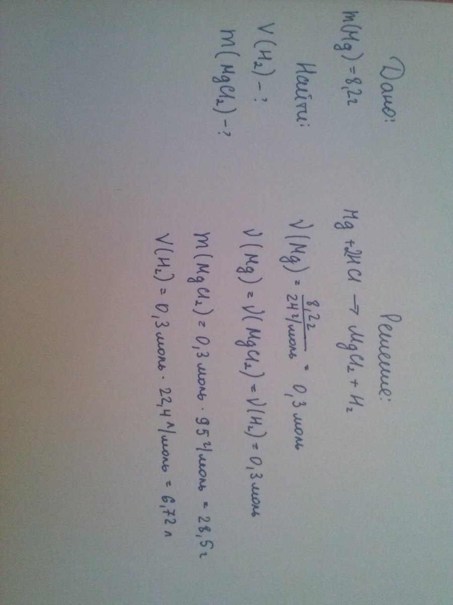 вычислите объем водорода который при растворении 8,2 г магния в соляной кислоте. рассчитайте массу образовавшейся соли