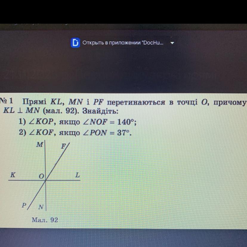 Так як прямі KL і MN вертикальні,то кут КОN=куту NOL=кутуLOM=кутуMOK=90 градусів. Оскільки кут PON=37 градусів, можна дізнатися градусну міру кута КОР. Кут КОР=кут KON-кут PON=90-37=53 градуси.Оскільки кути PON і МOF вертикальні то PON=MOF=37градусів.А отже кут KOP=куту FOL=53 градуси.Тому кут KOF=MOK+MOF=90+37=127градусів.