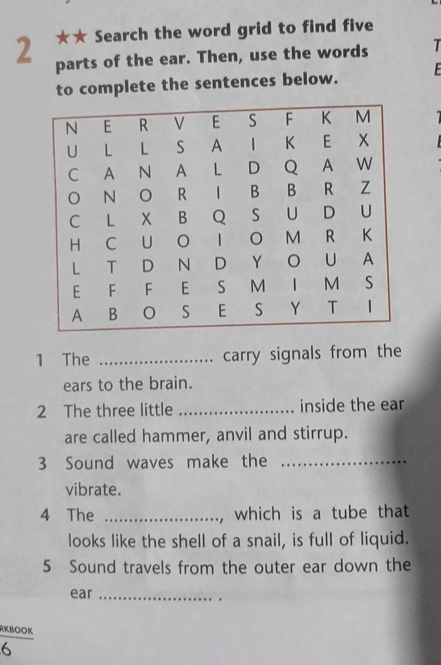 2 文文 Search the wond grid to find five ZSUOUIJW4 WJAZDUFA KIZOXDGEO SARGUZES 1 The N H C T 3 B E A SE SEDESOWS M EXO8520-> KEAEG832F 3 Sound waves make the wibrate. KM X A W 2 The three litte are called hammer, anvil and stirrup. K A S - carry signals from the 1 inside the ear which is a tube that looks like the shell of a smail,, is full of liquid. S Sound travels from the outer ear down the