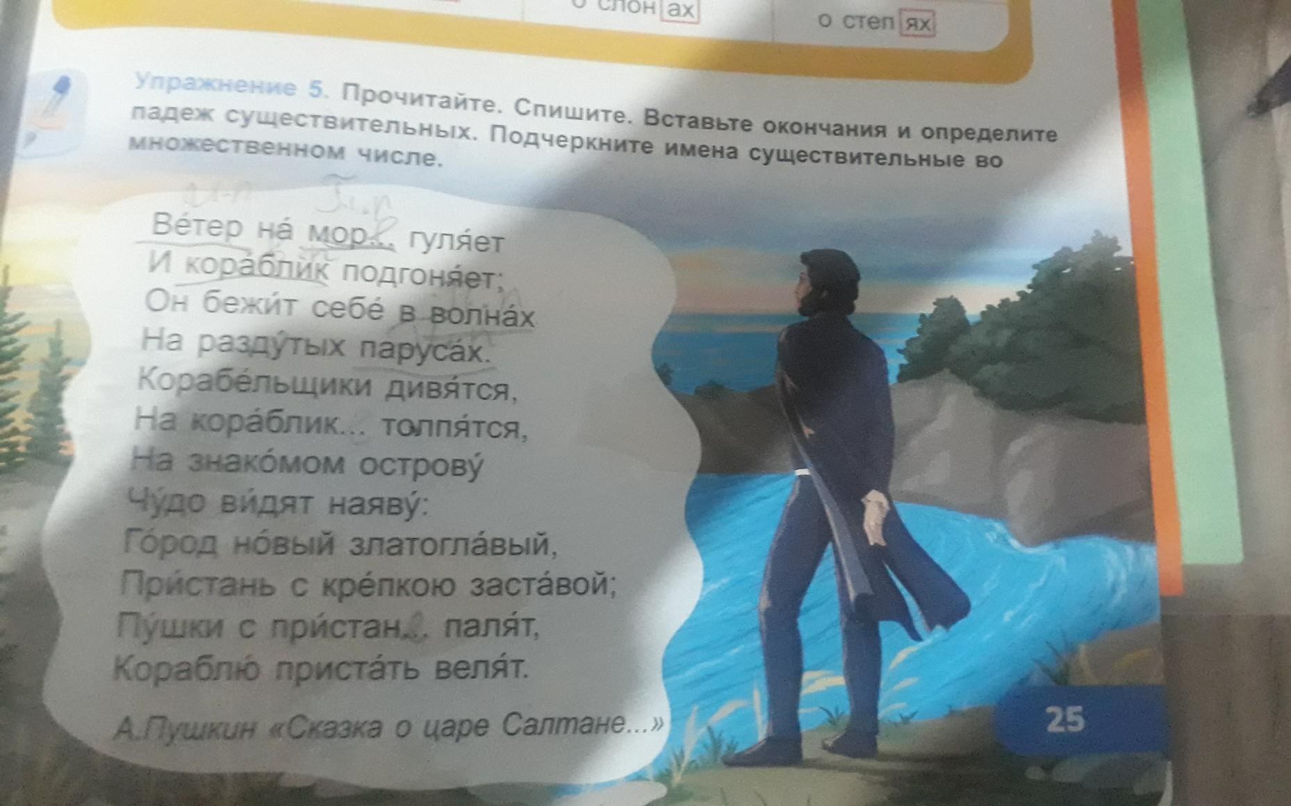 Упражнение 5. Прочитайте. Спишите. Вставьте окончания и определите падеж существительных. Подчеркните имена существительные во множественном числе. Вéтер на мор... гуляет И кораблик подгоняет; Он бежит себé в волнах На раздутых парусах. Корабельщики дивятся, На кораблик... толпятся, На знакомом острову Чудо видят наяву: Город новый златоглавый, Пристань с крепкою заставой; Пушки с пристан... палят, Кораблю пристать велят. А.Пушкин «Сказка о царе Салтане...>> 25