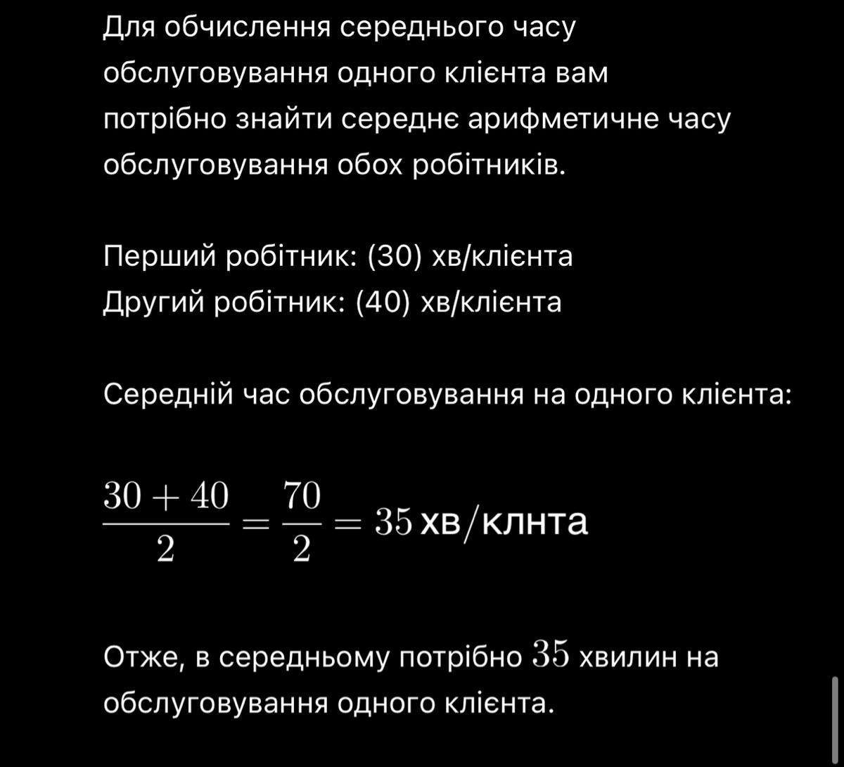 Два робітника банку виконують однакові операції з обслуговуванняклієнтів. Перший протягом двох годин обслуговував клієнтів, затративши на кожного по 30 хвилин, другий – 40 хвилин за той же період часу. Скільки часу в середньомупотрібно на обслуговування одного клієнта банку.