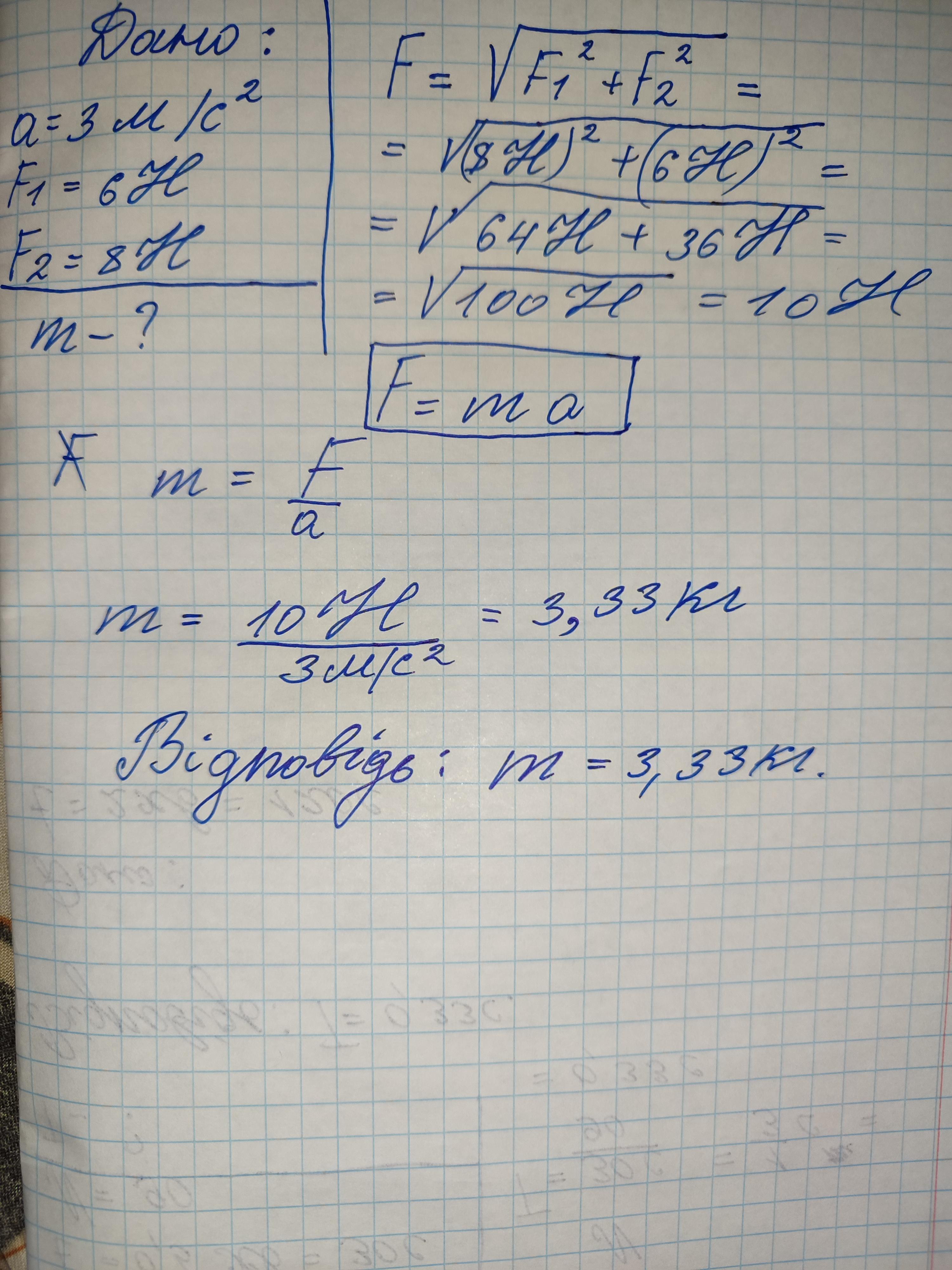 (2 бали) Тіло рухається з прискоренням 3м/с2 під дією двох взаємно перпендикулярних сил, модулі яких дорівнюють 6 Н і 8 Н. Визначте масу тіла.