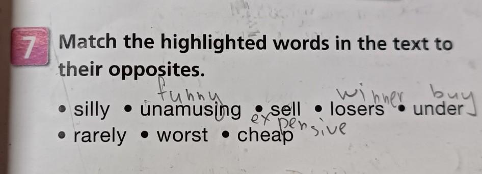 7 Match the highlighted words in the text to their opposites. funny silly • unamusing sell losers pensive • rarely worst cheap winner buy under