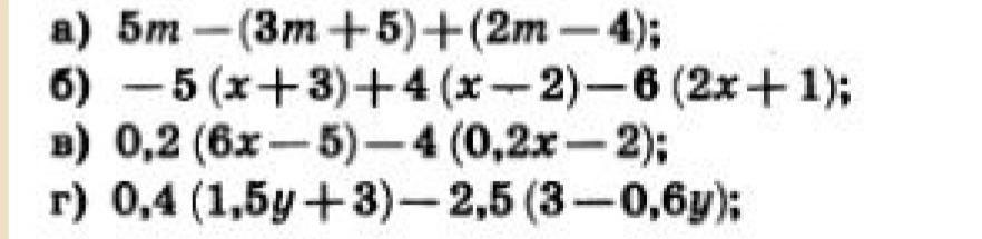 а) 5m-(3m+5)+(2m-4) = 5m-3m-5+2m-4 = 4m-9