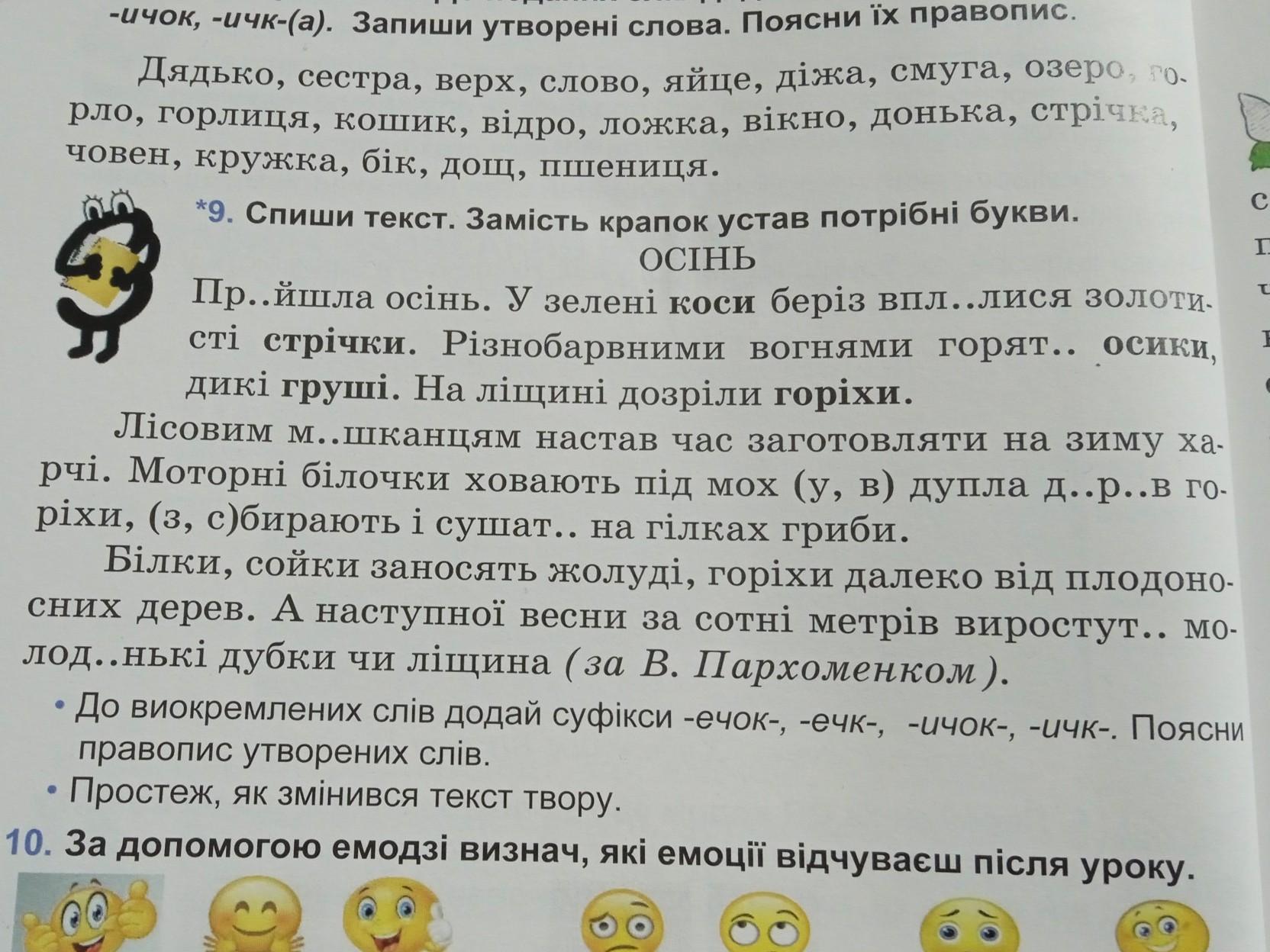 • До виокремлених слів додай суфікси-ечок-, -ечк-, -ичок-, -ичк-. Поясни правопис утворених слів.