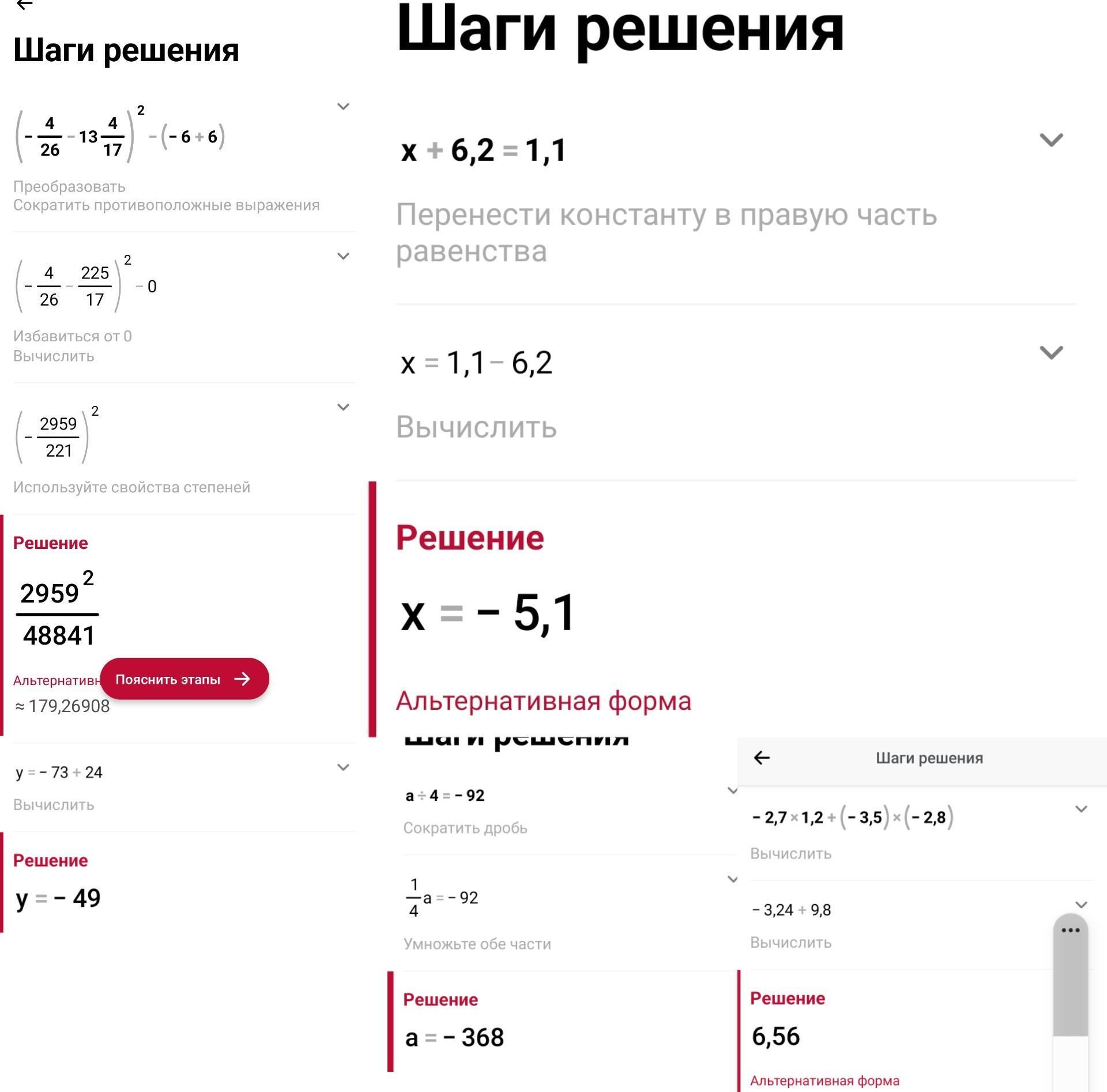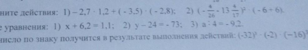 10 4 4. Выполните действия: 1) -2,7 - 1,2 + (-3,5) - (- 2,8); 2) (-2-1317). (-6+6). 77 . 26 5. Решите уравнения: 1) x+6,2 = 1,1; 2) y - 24 - - 73; 3) а: 4=-9,2. 6. Какое число по знаку получится в результате выполнения действий: (-32)3 . (-2) . (-16)