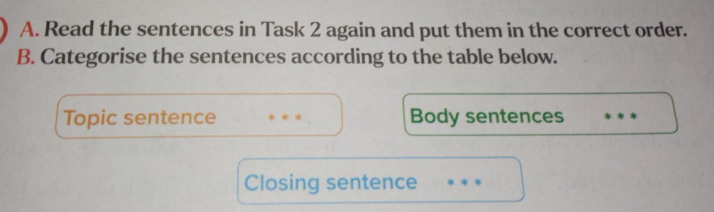 3) A. Read the sentences in Task 2 again and put them in the correct order. B. Categorise the sentences according to the table below. Topic sentence *** Body sentences Closing sentence *** ***