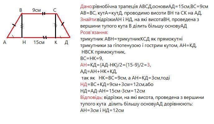 основи рівнобічної трапеції 9 см і 15 см знайдіть відрізки на які висота проведена з вершини тупого кута ділить більшу основу