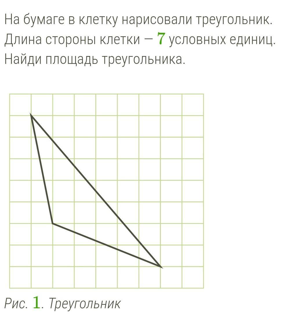 на бумаге в клетку нарисовали треугольник. Длина стороны клетки — 7 условных единиц. Найди площадь треугольника.