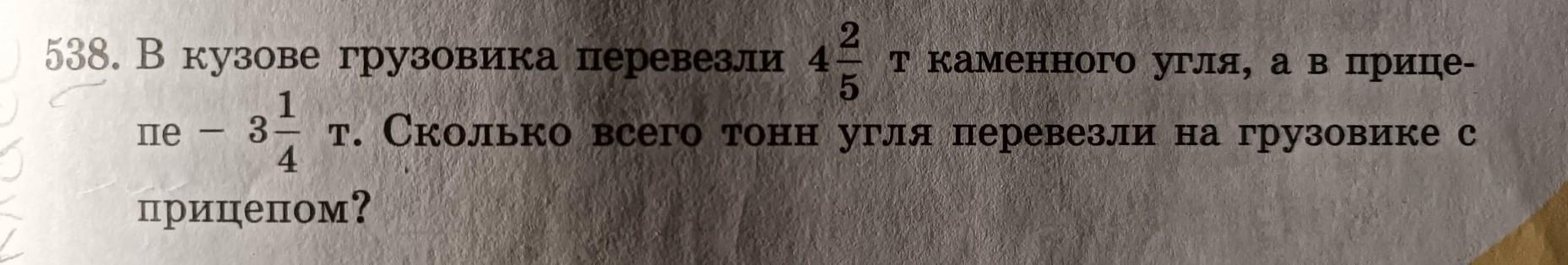 Чтобы узнать общий вес угля, перевезенного на грузовике с прицепом, нужно сложить вес угля в кузове грузовика и вес угля в прицепе:В кузове грузовика: 4 2/5 т = 4.4 т (тонны)