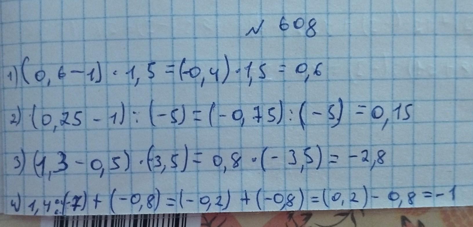 Вычислите (608, 609). 608. 1) (0,6-1) 1,5; 2) (0,25-1): (-5); 609, 1) 2) 3 5 • (-4) +5; 3 7; 3) (1,3- 0,5) (-3,5); 4) 1,4 (-7) + (-0,8); 3) 4) 2 12 (-3) — 1 4 4 5 ( 5) 6) 3 9 5) 3,5 6) 5,6 (-4)+0,4