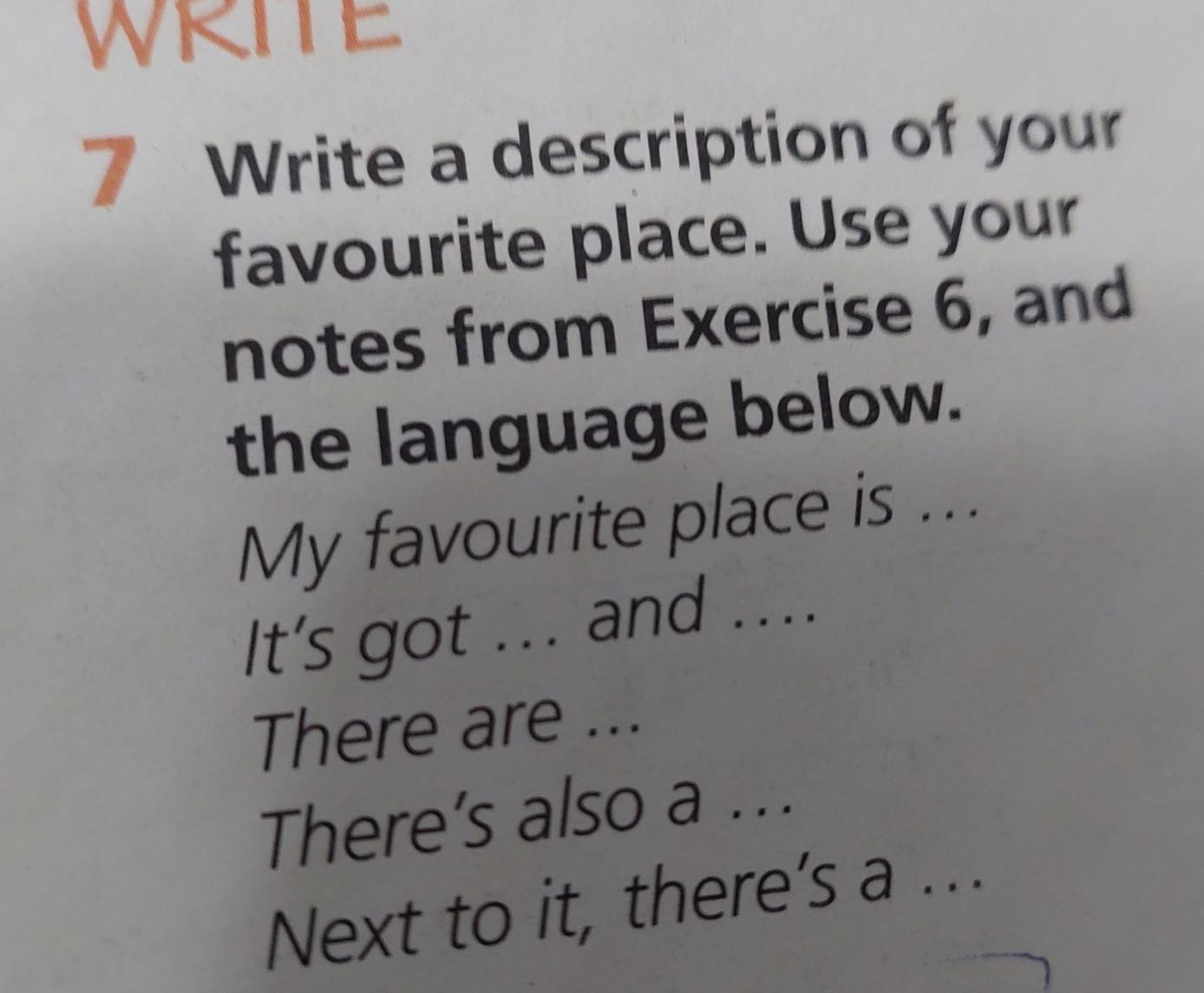 WRITE 7 Write a description of your favourite place. Use your notes from Exercise 6, and the language below. My favourite place is It's got... and There are There's also a Next to it there's a
