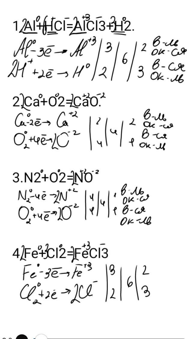 скласти окисно-відновні реакції використавши метод електронного балансу 1.Al+HCl=AlCl3+H2. 2.Ca+O2=CaO. 3.N2+O2=NO 4.Fe+Cl2=FeCl3