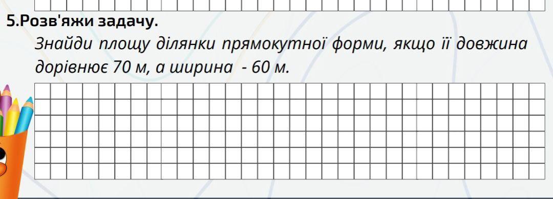 Площа ділянки прямокутної форми, якщо її довжина дорівнює 70 метрам, а ширина 60 метрів дорівнює 4200 кв. метрів. Виходить, що площу можна знайти за допомогою простих множень.