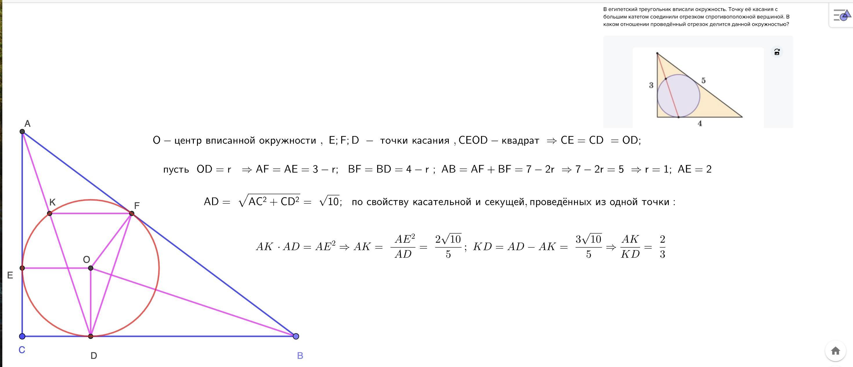 В египетский треугольник вписали окружность. Точку её касания с большим катетом соединили отрезком спротивоположной вершиной. В каком отношении проведённый отрезок делится данной окружностью?