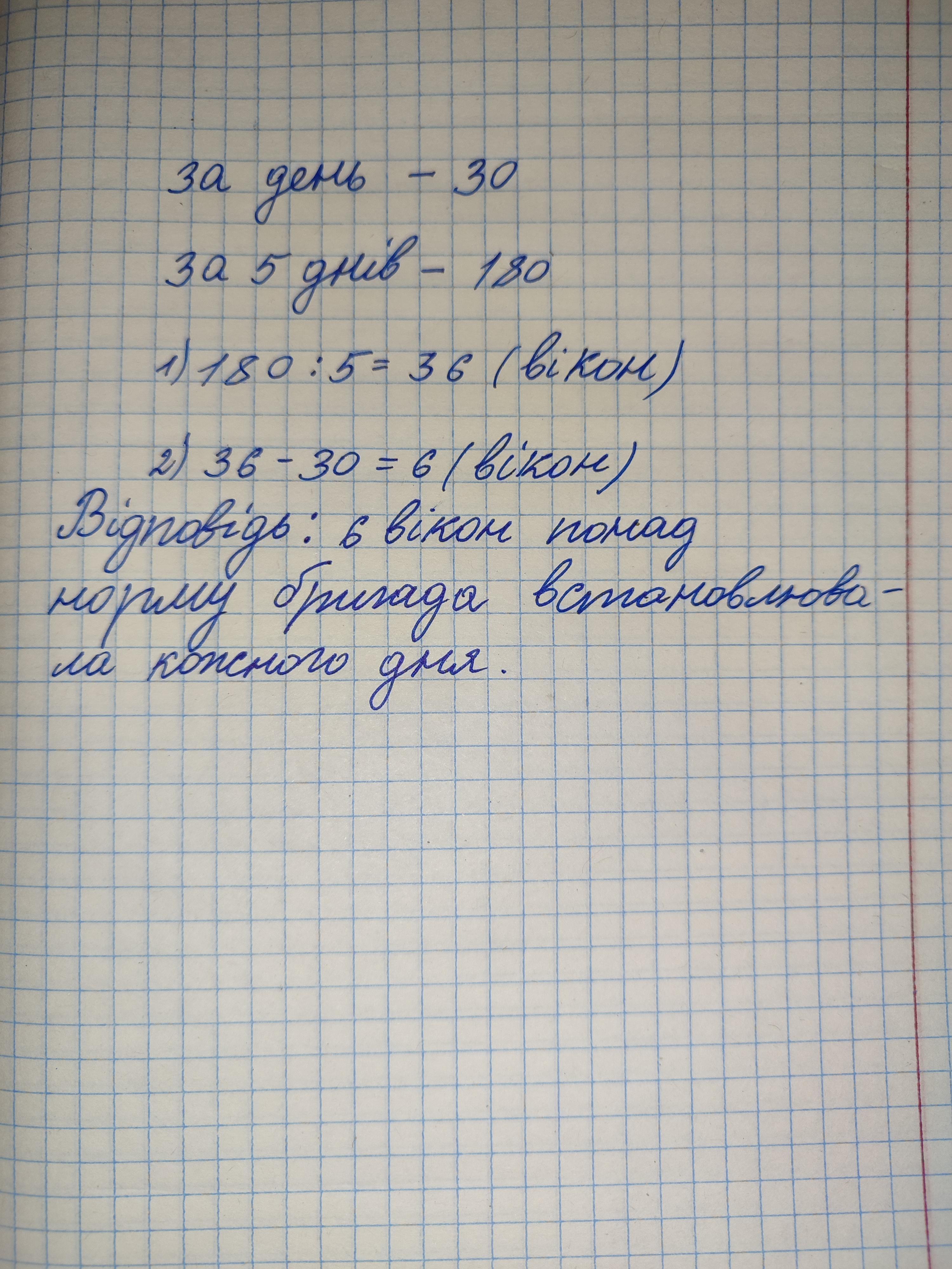за денною нормою бригада має встановити 30 вікон . за 5 днів робочого тижня бртгада ,працюючи з однаковою продуктивннистью ,встановила 180 вікон. скільк и вікон бригада встановлювала понад норму кожного дня