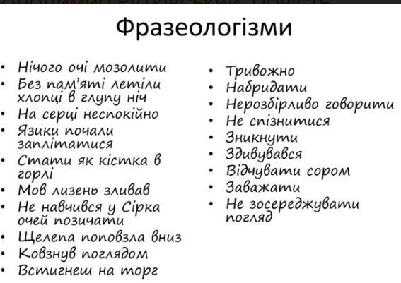 Випишіть у зошит фразеологізми разом із їх значеннями.