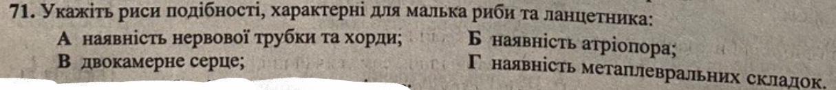 А) Наявність нервової трубки та хорди"** є подібною для малька риби та ланцетника, оскільки вони є ознаками, які характеризують хордових.