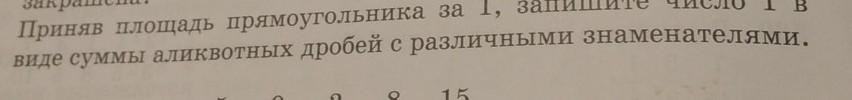 Приняв площадь прямоугольника за 1, запишите число 1 в виде суммы аликвотных дробей с различными знаменателями.