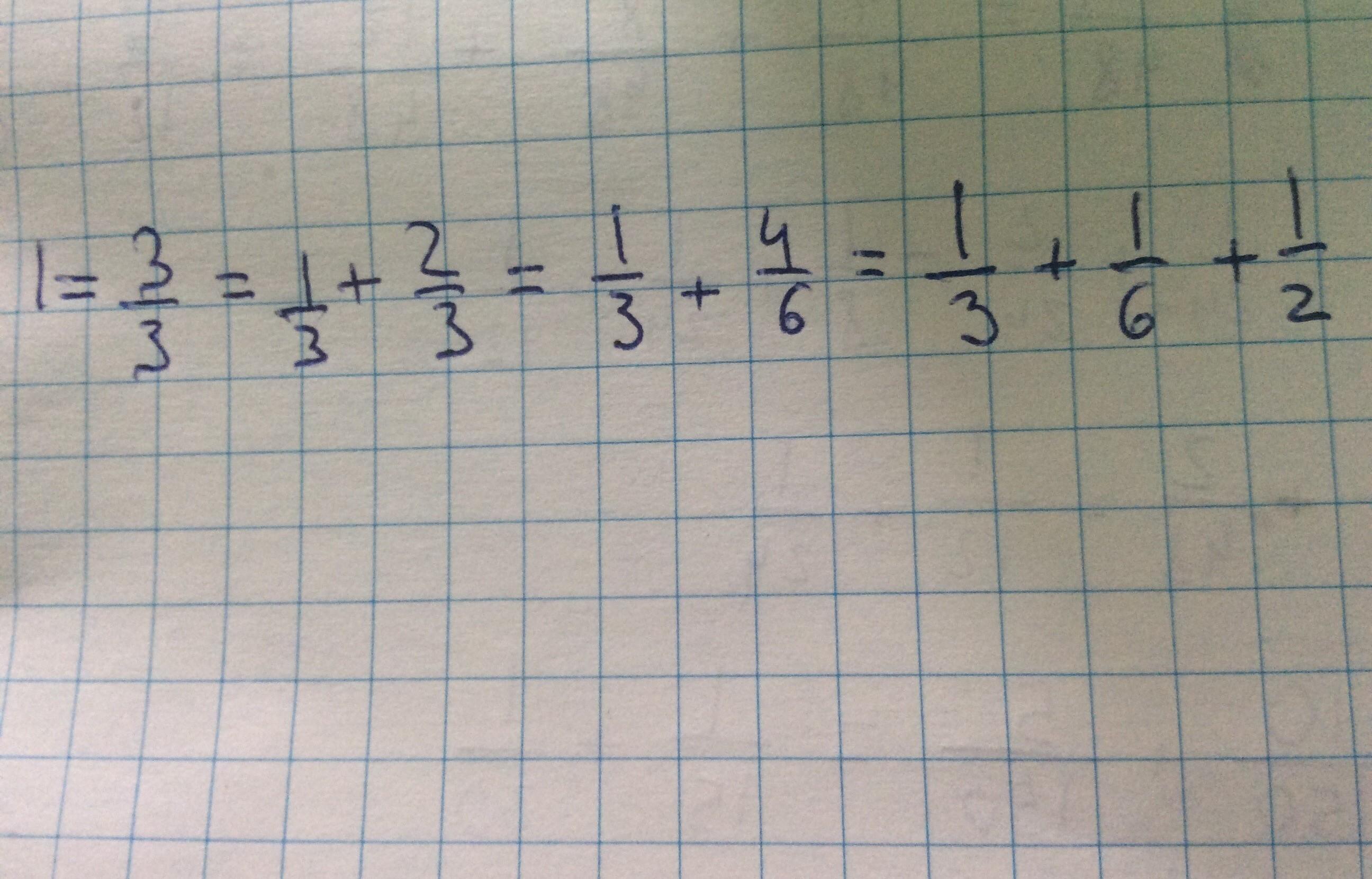 1=3/3 =1/3+2/3=1/3+4/6=1/3+1/6+1/2
