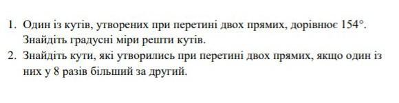 1. Один із кутiв, утворених при перетині двох прямих, дорівнює 154°. Знайдіть градусні міри решти кутів. 2. Знайдіть кути, які утворились при перетині двох прямих, якщо один із них у 8 разів більший за другий.