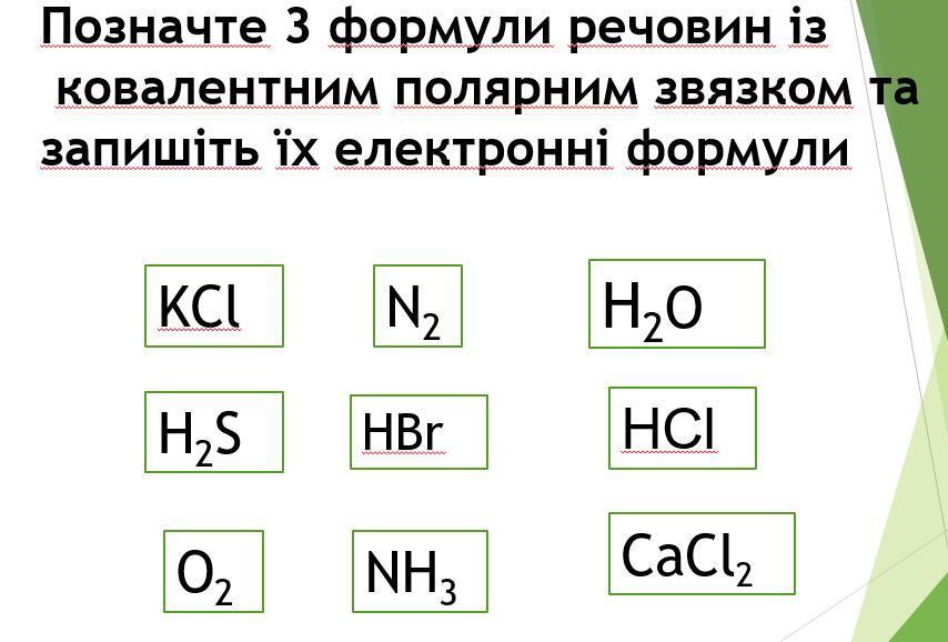 Позначте 3 формули речовин із ковалентним полярним звязком та запишіть їх електронні формули
