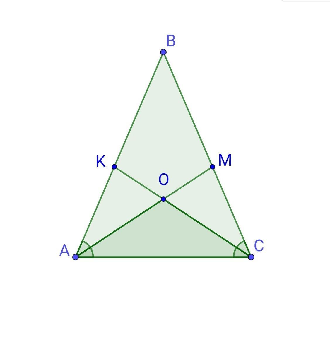 бісектриса AM і CK кутів при основі AC рівнобедреного трикутника ABC перетинаються в точці O. Доведіть що трикутник AOC рівнобедрений
