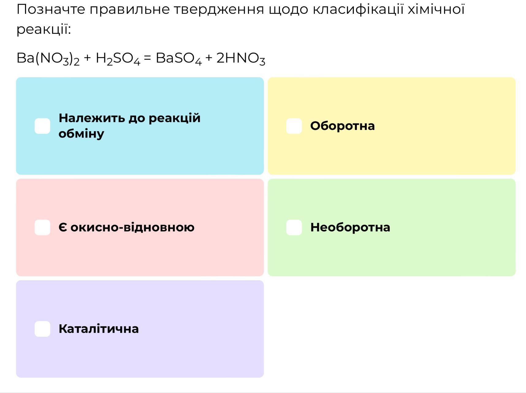 Позначте правильне твердження щодо класифікації хімічної реакції ДОПОМОЖІТЬ ПЖШКА 30 БАЛІВ