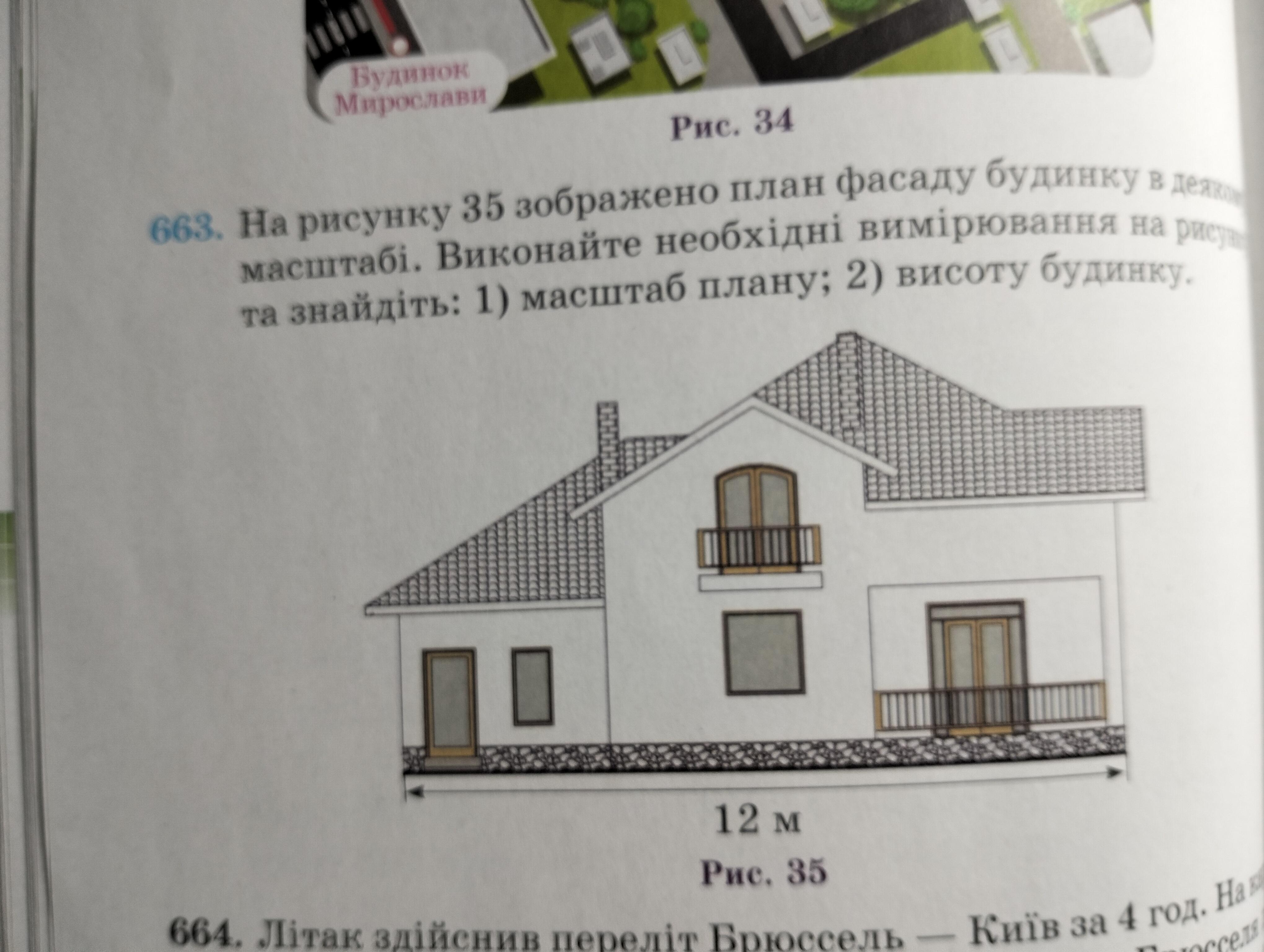 . На рисунку 35 зображено план фасаду будинку в деякому масштабі. Виконайте необхідні вимірювання на рисунку та знайдіть: 1) масштаб плану; 2) висоту будинку